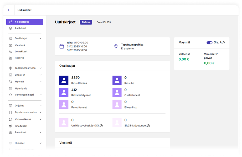 Eventos on markkinoiden kattavin tapahtumanhallintajärjestelmä. Saat kaiken tarvitsemasi yhdestä osoitteesta – lippukaupan, tapahtumasovelluksen, virtuaalialustan, näyttelynhallinnan ja paljon muuta.