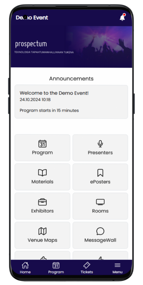 Visualisoi Eventos App yrityksesi tai tapahtumasi ilmeen mukaiseksi logoja, bannereita ja eri värimäärityksiä hyödyntäen. Sovelluksella jaat kaiken oleellisen tieto helposti – ohjelma, puhujat, kartat ja muu sisältö löytyvät yhdestä paikasta.